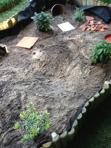 We spent yesterday sorting an outdoor enclosure for our tortoise-to-be. It's not totally finished - needs more soil/sand, and the weed membrane needs trimming. I've got a wooden house coming too. And we have mesh for the top for protection. | |