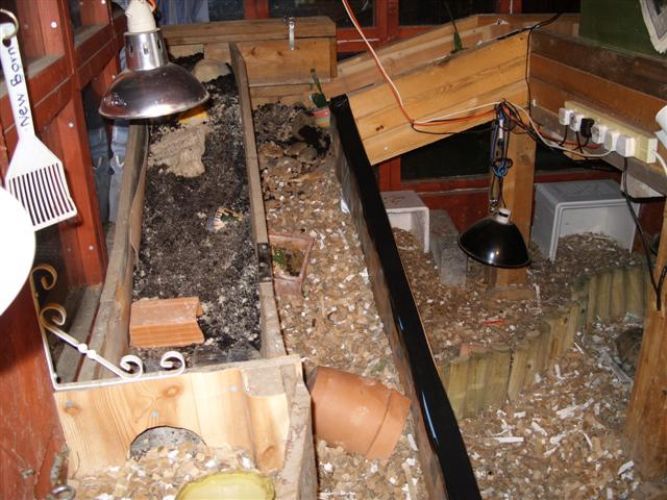 Hi Elly The first thing to tell you is that you may not get it right the first time even with good advice. As in my case, I set up thinking it is just as I want it and then I find I need to change everything round again. One of the features I have in my shed that I don’t move around is that Geoff installed me electric cabling in between the outer shed wall and the inner lining alongside the insulation material. He had double power point sockets installed at both ground and waist level and also had me an electric light fitting and switch installed (necessary for me on darker nights and mornings). I was wondering about the ‘sun’ lamps you have as if you bought them from a reptile shop as a basking bulb the chances are that they emit UVA rays only and not the important UVB rays (Check out these terms in the glossary which you will find in the Library section on the menu on the left side of this page). If these are the bulbs you have then you need to get your tortoises outside as much as possible so they may benefit from the sun’s UVB rays and think about purchasing UVB lamps for the cooler weather when your torts won’t be able to go outside as much as now. I’ll have a think about the rest and get back to you. HTH for now | |